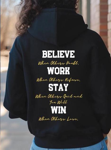 Step into motivation and style with our Believe. Work. Stay. Win. hoodie. Designed for dreamers, doers, and achievers, this hoodie is more than apparel—it’s a mindset. The bold typography paired with uplifting words reminds you to keep going even when others doubt, refuse, or quit. Made with soft, premium fabric, it’s perfect for staying comfortable while you chase your goals. Whether you’re at the gym, in class, or simply out and about, this hoodie makes a statement: success comes to those who stay the course.