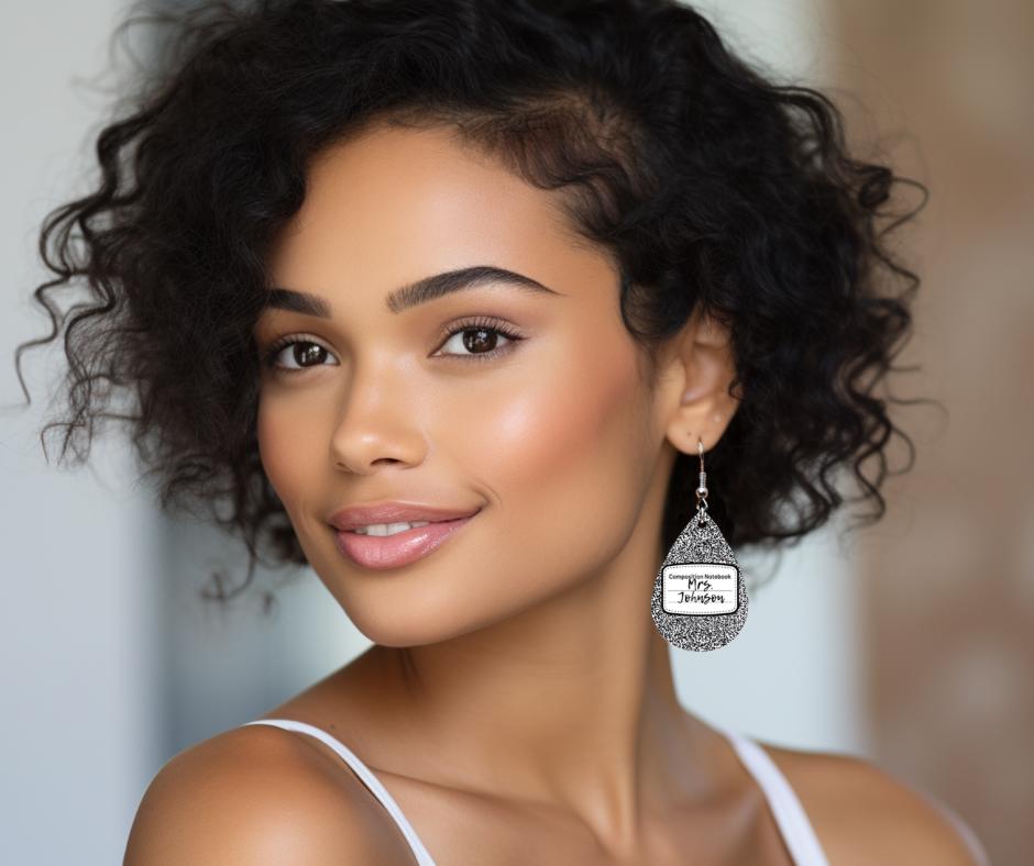 Show off your school spirit with these customizable composition book teardrop earrings! Designed to resemble the classic black-and-white notebook cover, these earrings can be personalized with your name, school, or a fun message. Perfect for teachers, students, or anyone who loves a touch of nostalgia with their style!