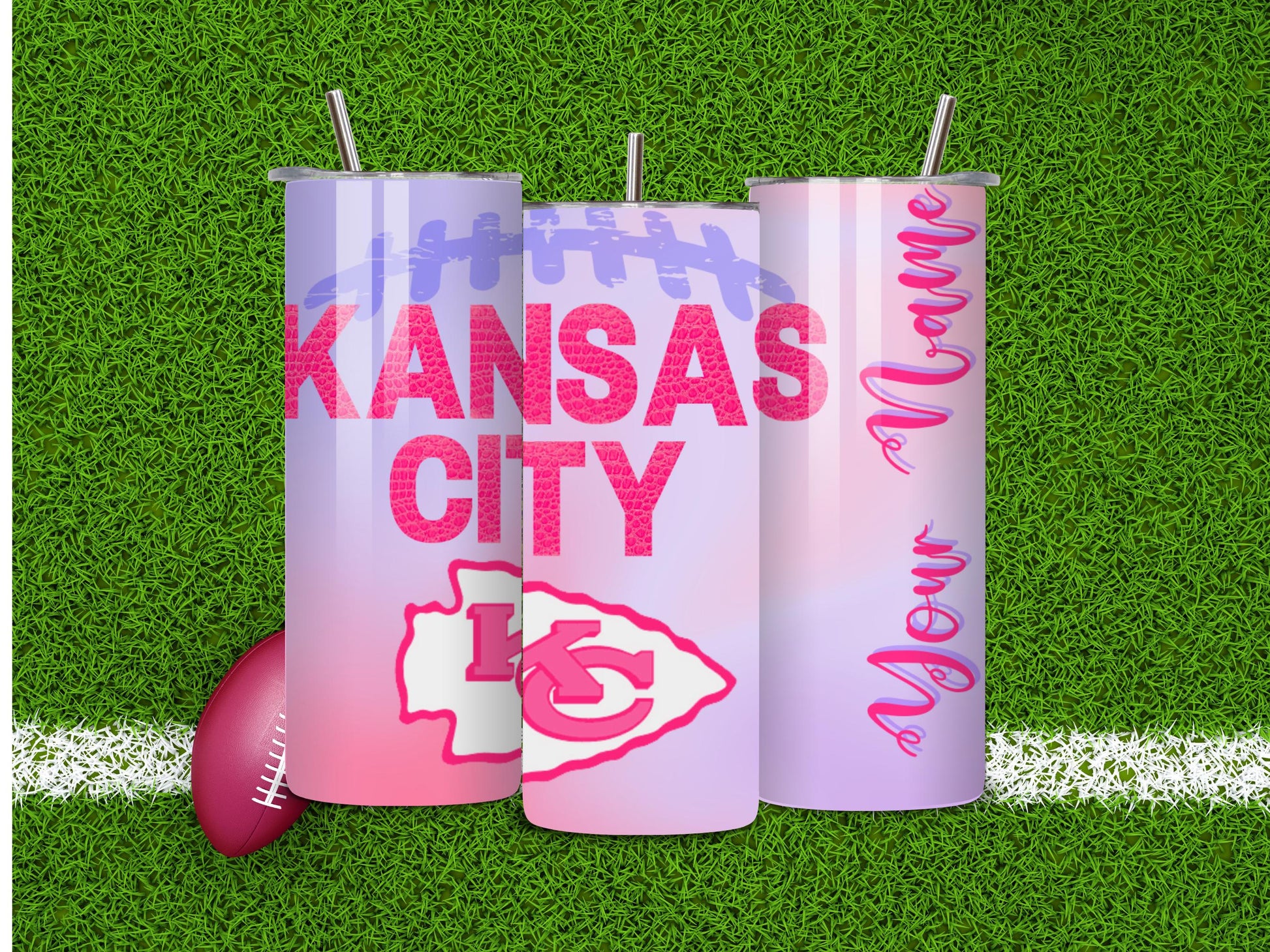 Celebrate your favorite team in a bold and creative way with the Kansas City Chiefs Football Frenzy Tumbler. Adorned with eye-catching textures, a football silhouette, and the iconic Chiefs logo, this design stands out in vibrant pinks and purples. Add your name to make it uniquely yours! Ideal for game days or everyday use, this tumbler combines practicality with personality.
