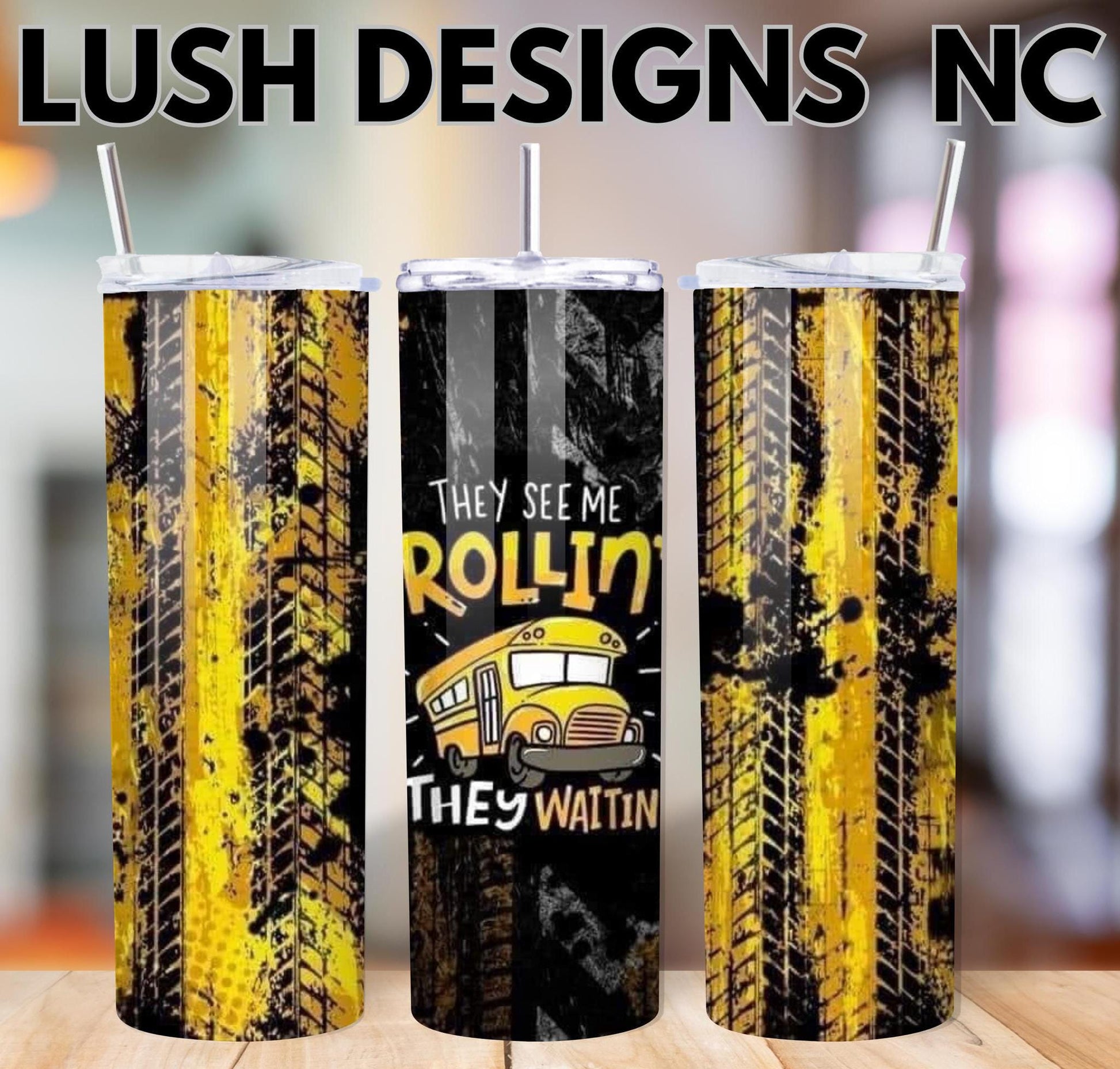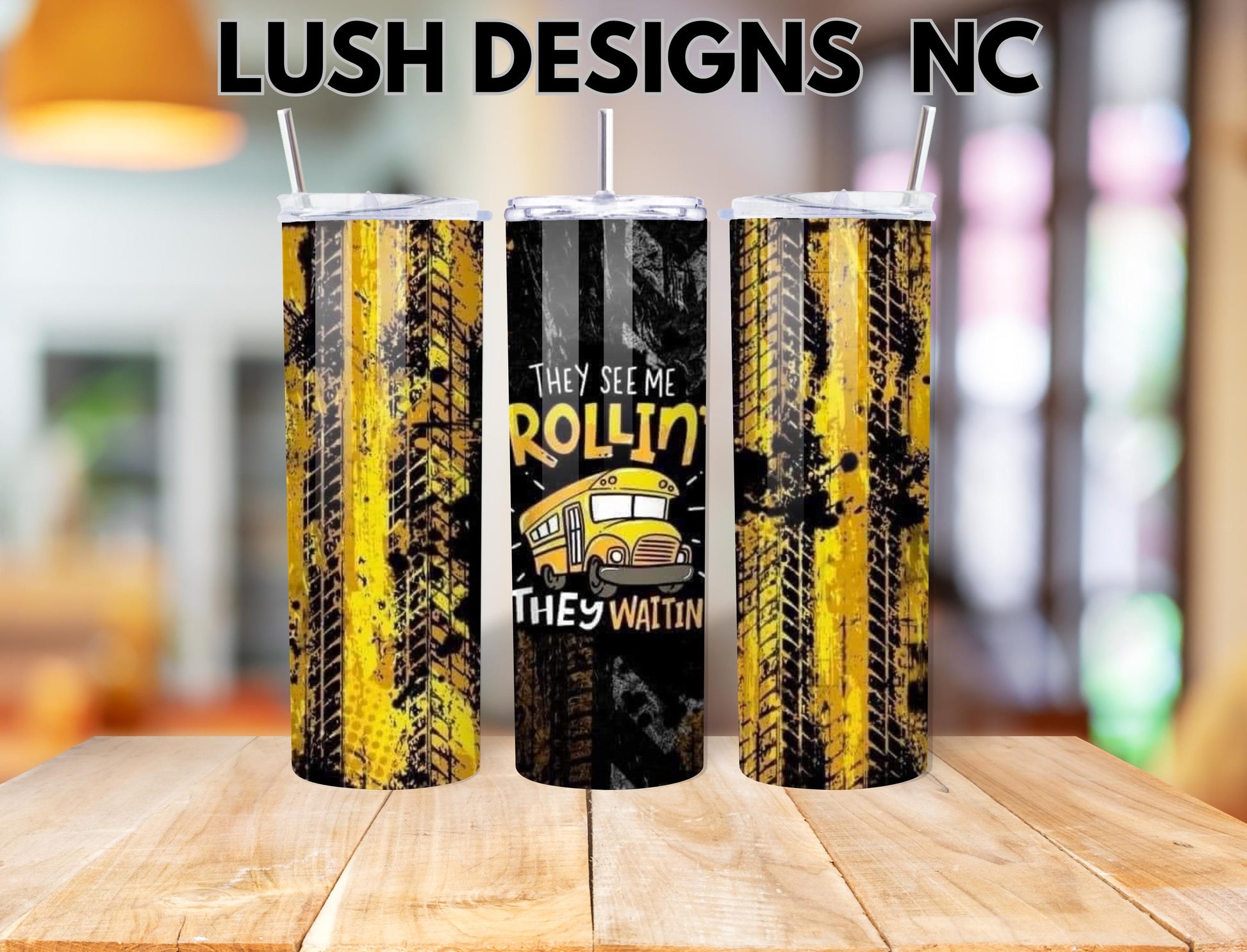 Keep your drink cool and your vibe cooler with our "They See Me Rollin' Tumbler" from Lush Designs NC! Featuring bold tire tracks, a grungy yellow-and-black design, and a playful school bus graphic, this tumbler is perfect for bus drivers, school staff, or anyone who loves a little sass with their sip.